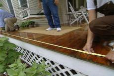 RON HAZELTON: Okay. (TALKING CONTINUES IN THE BACKGROUND - INAUDIBLE) The posts on the front of the porch are spaced just about perfectly. The way we see it, the railing sections can be set in between. On the side, though, we’ll have to add a post in the center. So let’s start. Kathy, take this, just find the center of this deck right here.