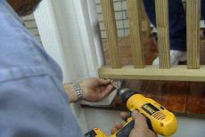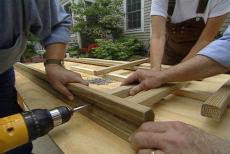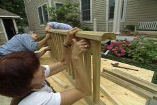 RON HAZELTON: Instead of nails, we’re using a square head driver bit in our drill and finish head screws to attach the railings to the post. (TALKING IN BACKGROUND - INAUDIBLE) I drilled a small pilot hole here. These are just easier. You know, anything on an angle like this is not the easiest thing for a lot of us, so this goes in a lot easier.