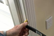 I press the tape firmly in place, making sure to run it at least six inches up the jamb. At the corners, I make two small cuts -- then fold the tape over the edges. I put down a second strip on the threshold, then apply it along the entire opening, again making sure to wrap the corners.