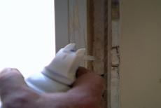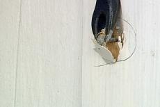 In order to prevent damage to the surrounding wall, I'm using the utility knife to cut through the paint and caulk around the edges of the door casing. Then, I drive a putty knife into the scene and pull the casing away, just enough to insert a pry bar -- then work the molding free.