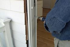 Outside, I place one final layer of butyl backed aluminum tape on top of a nailing fin. Then, Jeff and I lift the sliding door onto the bottom track. Next, I install the exterior wood trim, first on the top -- then on the sides.