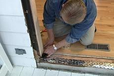 Now I have to do a few things to prepare this rough opening for the new door, and the first one is to make sure that the sill down here is level and that the sides are plumb. Good. And -- excellent.