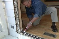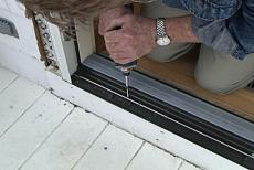 Next, I run two screws through the latch side of the frame, through the shims and into solid wood. Then go back outside to put the rest of the nails in the metal fin. Before I put screws through the sill, I fill the holes with silicone to make certain there will be no leaks around the fasteners. Finally, I drive in screws at the top. Now that door is not going anywhere.