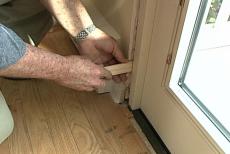 So I've asked my friend Jeff to give me a hand lifting it into place. Driving a couple of roofing nails through the fin, holds the door in position temporarily. Inside, I check the sill for level and the jambs for plumb. Then begin shimming the door to hold it securely in place.