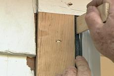 By taking off this strip at the top of the frame, I can remove the sliding door. Anything I can take out of the frame now means less weight to handle when it comes time for removal. On the outside, I remove the screen and cut through the caulk at the edges of the exterior trim. Well, I have an interesting problem or maybe I should say challenge right here. I want to remove this piece of wood trim, but I can't get a pry bar behind it. It's kind of sitting behind the siding or shingles on this and the door frame over here.