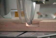 When the two pieces are placed together, the notches will form a square hole or mortise. The bottom rail or brace will be inserted into this hole. We cut the notches by making repeated passes with the sliding compound miter saw which is set to cut only halfway through the 2 by 4.