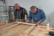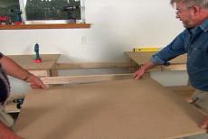 Well, all of our sections are built, so we can start setting them in place. The lower section of the bench, designed to accommodate the saw, will rest on two 2 by 4s that we attach to the base legs on either side. Because workbench tops often take a bit of a beating, we decide to add a replaceable surface made of 1/4 inch hardboard or masonite. Once we've cut them to size, we apply double stick tape to the bottom, peel off the backing strip and press our disposable panels in place.