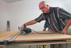 Our bench base is starting to take shape. Now we'll place 2 by 4s across the lower rails and screw them in on each end. Laid side by side, these will form a handy storage shelf. The top of our workbench will be cut from sheets of 3/4 inch MDF or medium density fiberboard. This clamp-on straight edge provides an accurate guide for the circular saw, just about guaranteeing a straight cut.