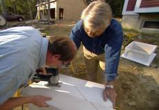 Okay. All right Chris, we're all set to cut. Right there. Great. Next, Chris uses a jigsaw to cut along our guidelines. With just one chance to get it right. There we go. Looks good. We'll go up to the roof and see if our measurements made the cut.