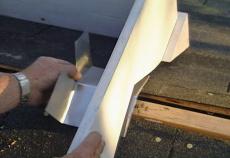 We don't want any water to seep underneath the cupola. So I'll use some flashing to cover the seam between the roof and the base. Now here’s what's going to happen next. These two by four blocks are going to get screwed to the roof right inside here. And then we're going to nail through the side of the cupola base.