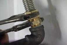 Then I can drive in additional screws which secure the mounting brackets. Now the plumbers can come back to make the final hookups. First, Mike connects the gas shutoff valve and sediment trap -- that's the short section of pipe running downward, then attaches the corrugated stainless steel supply line.