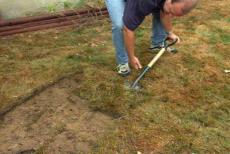 We have to dig the entire area of the patio some seven inches deep. We'll fill the hole with three and a half inches of drainage gravel, one inch of sand and then we'll add the paver stones which are two and a half inches thick. Right now we're just about six, a little over.