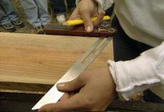 RON HAZELTON: Aces. Now bring your tape out as close. . .most of our pieces will require angled cuts. So, it’s time for lesson #2. Katie measures and marks the angle to cut on the lumber according to the diagram. Then Lindsey learns to use the bevel gauge so that she can transfer that angle to the power miter saw. Okay, pull it up, up. There you go. Then slide it sideways. There you go. Okay and just push the handle down and that’ll lock it. This is a stop here. . .Because the three tables we’re building have identical pieces we’ll set up a stop on the saw that speeds up the process and ensures that all of the parts will be exactly the same length.