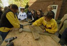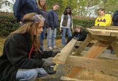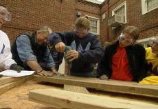 RON HAZELTON: Setting the first plank for the tabletop in place had the Deltas singing. But it was time for more clearance holes and more screws. Music class I guess will have to wait for awhile. Well the Tri-Delts are doing a great job. And they’ve gotten power tools down to a science. But there’s always time for a tip from the professor. Mandy?