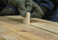 RON HAZELTON: The benches are next. We’ll make sure the outside board overhangs the supports evenly on both ends and the sides. The combination square keeps the offset consistent. It’ll come right up on its side like this. . .Well the sorority project is almost complete. It looks great. But the table still seems a little shaky, so our next step is to add some bracing to the underside. . . .Adding one more brace right here, the one you’ve got in your hand. One of these on each side and we’ll be ready for a picnic.