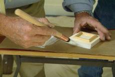 Now here's our chance to be creative. Steve pulls out some leftover half round which we cut into short pieces with miters on both ends. Applied to the face of the block, these will form a sort of raised panel look. It's a simple touch, but one that adds a nice detail.