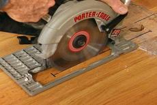 I'm setting the blade depth on the circular saw just deep enough to cut through the flooring. This is called a plunge cut and it should be done very cautiously. With the saw running, I lower it slowly until the base plate is resting firmly on the floor.