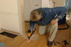 The only choice is to face nail it. And that's what I'm doing right now. Now one of the trickiest parts of the flooring repair job like this is touching up or matching the finish. Now if you look over here at this section of the floor, you'll see that this an oak floor.
