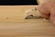 Or at least the illusion of one by taking a straight edge like this. Then I scrape off the finish right up to the line. Now all I haVe to do is fill the nail holes, do a final hand sanding with a small block and fine paper.