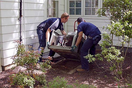 Out with the Old. Central air conditioning systems have two main components: an outdoor condenser and an indoor air handler. The video shows how these two units work together. Both pieces of equipment were taken out and the installation company took away all of the old equipment and materials. A good installer, by the way, should always do this.