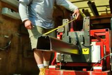 The first step is to take down the old gutters by removing the gutter spikes that secure the gutters to the fascia board. Because the gutter is seamless, it's fabricated on location. This mobile factory of sorts converts a roll of heavy-duty sheet metal into an intricately-shaped one-piece profile that can be as long as needed.