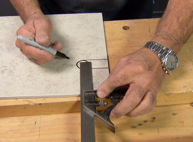 Draw the hole at the desired location then extend lines from the rim of the circle to the edge. Next carry these lines around to the back of the tile and reproduce them.